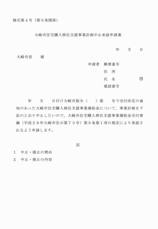 第9条 交付決定者は,自らの意志で補助金の交付を受けることを中止しようとするときは,大崎市住宅購入移住支援事業計画中止承認申請書(様式第4号。以下「中止申請書」という。)を市長に提出しなければならない。