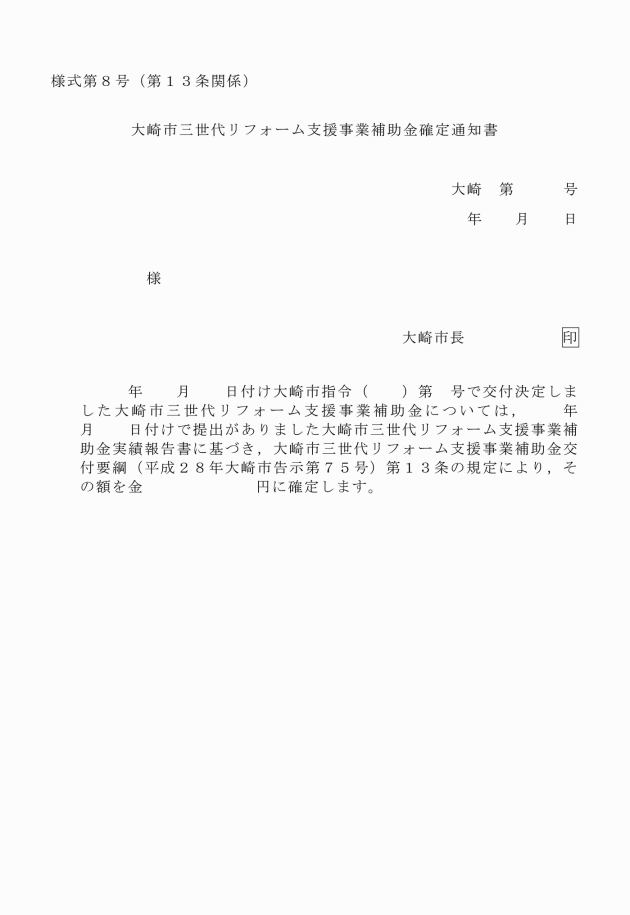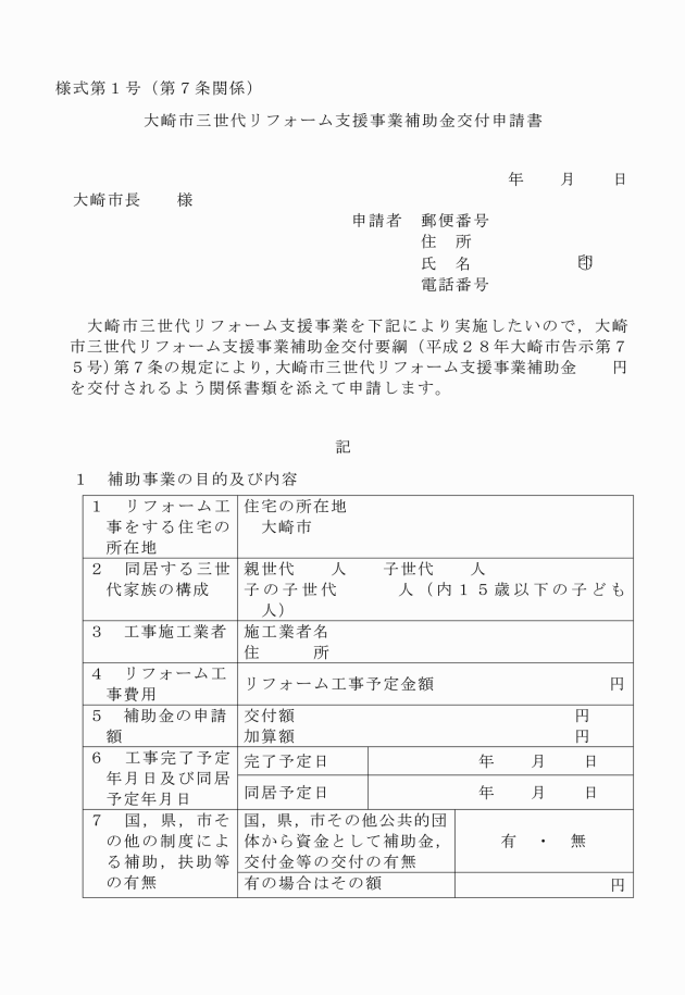 第7条 補助金の交付を受けようとする者は,リフォーム工事に着手する前までに,大崎市三世代リフォーム支援事業補助金交付申請書(様式第1号。以下「交付申請書」という。)を市長に提出するものとする。